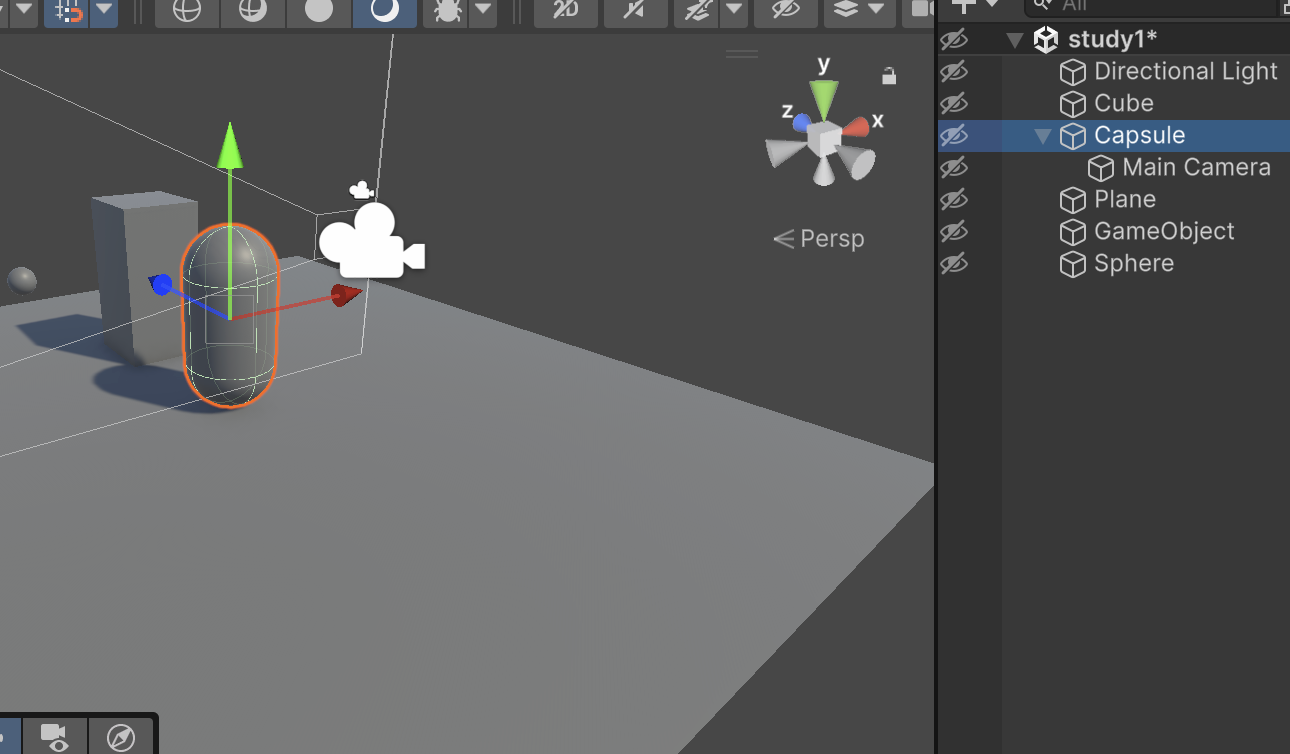 Hierarchy의 눈 아이콘을 누르면 scene 창에서 요소가 안보여야 하는데..(가시성 조정) 작동이 안 된다.
