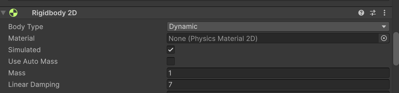 | Use Auto Mass | 질량을 자동으로 계산할지 여부. 활성화 시, Rigidbody2D가 연결된 콜라이더 면적 등을 기준으로 질량 자동 산출. 수동으로 조정 불가. |