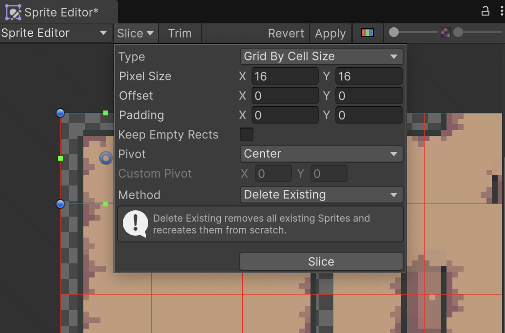 - 스프라이트 임포트 설정: Texture Type을 Sprite (2D and UI)로 설정, 필요 시 여러 타일이 한 이미지에 있으면 Sprite Mode를 Multiple로 설정 후 Sprite Editor에서 개별 타일로 자름 : 보통 제작자가 사이즈 정해놓음 (16*16 등)